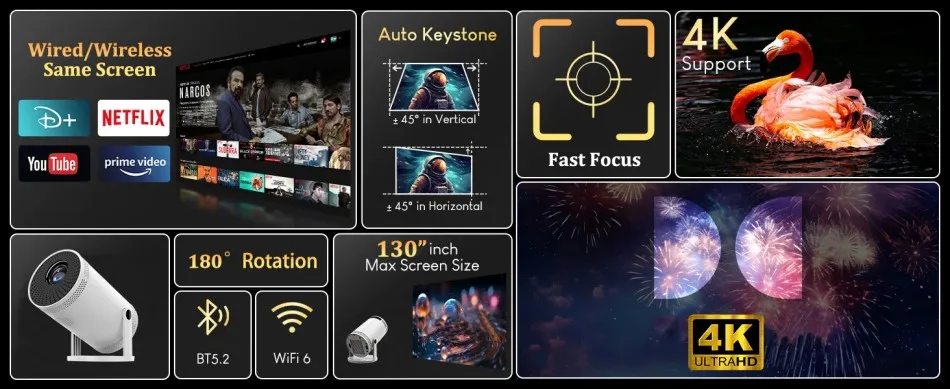 • Crystal Clear 1080p Video: Supports 4K input with bright, vibrant projection up to 120 inches.